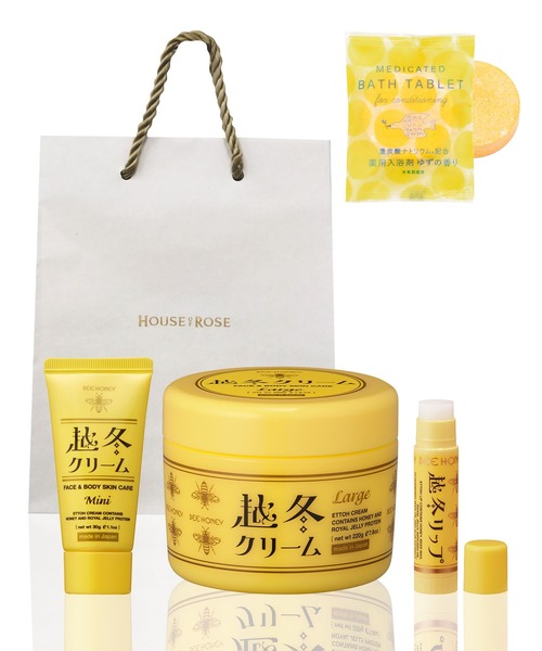 --------------------------------------------- ZOZO限定 越冬贅沢セットが再登場☆彡 --------------------------------------------- ジャータイプでたっぷり大容量の「越冬クリーム n 220g」と、持ち歩きに便利なチューブタイプの「越冬クリーム n 30g」に加え、大人気「越冬リップ」も!更に、パッケージもキュートな「森たちバトン 重炭酸タブレット ゆずの香り(1回分)」を今だけプレゼント♪「オリジナル ショッピングバッグ」付きです☆ 大切なあの人に… がんばった自分に… ほっこり嬉しい、ホリデーギフトをいかがですか☆彡 <セット内容> ■ビーハニー / 越冬クリーム n 〔全身用保湿クリーム〕220g/30g ハチミツやローヤルゼリープロテイン(加水分解ローヤルゼリータンパク)などのお肌にうるおいを与えて満たす、みつばちの恵みを詰め込んだリッチクリームです。乾燥した角層へ浸みこむシナジーモイスト成分*が乾燥・肌荒れを防ぎ、しなやかなお肌に導きます。 お顔だけでなく、乾燥の気になる部分、全身にお使いいただけます。 寒い冬を明るくしてくれる快活で透明感のあるみずみずしいハニーサックルの香りです。 ※無着色・無鉱物油 〔使い方〕適量を手にとり、乾燥の気になる部分になじませてください。 *加水分解コラーゲン・加水分解ヒアルロン酸・コメヌカスフィンゴ糖脂質(すべて保湿成分) ■ビーハニー/越冬リップ 〔リップクリーム〕4.5g ハチミツやミツロウ、ローヤルゼリー(保湿成分)などみつばちの恵みと-40℃で生きるクラウドベリーの種子油(ホロムイイチゴ種子油)(保湿成分)などの植物の恵みを詰め込み、冬の乾燥から唇を守ります。 おだやかに温かく包み込む、甘くなめらかなハニーの香りです。 ※無着色・パラベンフリー・アルコール(エタノール)フリー 〔使い方〕容器から5mm程度くり出して、唇になじませてください。 ■【医薬部外品】 森たちバトン 重炭酸タブレット ゆずの香り 〔チャーリータブレット〕 〔薬用入浴剤〕 40g(1回分) 重炭酸ナトリウム(有効成分)配合の薬用タブレット入浴剤です。 温浴効果により血行を促進。疲労回復や腰痛、肩こり、冷え症などつらい症状をやわらげます。 肌あれや湿疹を防ぎ、やさしい肌あたりです。 5つのうるおい成分(ホホバ油・コラーゲン・乳清(ホエイ)・ローヤルゼリーエキス・ヒアルロン酸)を配合し、しっとりとやわらかなお肌に整えます。 湯色はクリアライトイエローです。 ゆずの香り 〔使い方〕浴槽(150~200L)に本品を入れ、よく溶かしてご入浴ください。 ■ショッパー サイズ:約W18×H22.3×D8.5(cm)※持ち手含まず 【ハウス オブ ローゼ について】 厳選した植物由来成分を使用したお肌にやさしい自然派コスメブランドです。安全性や低刺激にこだわりながら、香りや感触、使うときの心地良さを追及したスキンケア、ボディケア等を取り揃えています。 --------------------------------------------- 【アイテムのお気に入り追加♥】 再入荷 / ラスト1点 などをお知らせします。 【ショップのお気に入り追加♥】 新商品 / 再入荷 などをお知らせします。 --------------------------------------------- 【関連ワード】 コスメショップ バス&ボディ 越冬 ビーハニー/越冬クリーム ビーハニー越冬クリーム ボディミルク クリーム オイル ボディをしっかり保湿したい 越冬クリーム 越冬クリームN 越冬シリーズ 限定商品 保湿 乾燥 かさつき