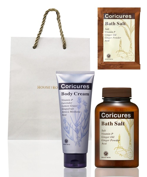 ココロとカラダ、軽やかに。 ZOZO限定 ハーブの香り豊かなボディケアセット☆彡 ストレスフルな毎日をがんばっているあなたへ。 香り豊かなハーブであなたをじっくり解きほぐす【コリキュアーズ】シリーズから、 【ZOZO限定 / コリキュアーズ おやすみボディケアセット】が登場! バスソルト分包(1回分)のプレゼント付き♪ 「オリジナル ショッピングバッグ」も付いているので、ギフトにおすすめです☆ ----------------------------------- 「リーフィージンジャーの香り」のバスソルトが、穏やかな香りで包みながら、一日頑張ったカラダを温浴効果で温めます。 入浴後に「シトラスラベンダーの香り」のボディアロマ クリームで、芳香浴しながらお肌をしっとりしなやかに。 心地よいリラックス感に包まれながら、ココロもカラダも解きほぐし、よい眠りにつく準備を☆彡 いつもがんばっている、あの人に... 自分へのご褒美に… 心が喜ぶギフトをいかがですか☆ <セット内容> ■コリキュアーズ バスソルト 〔浴用化粧料〕330g 温浴効果で発汗を促し、ボディを温めるバスソルトです。 豊富なミネラルを含んだソルトがお肌にうるおいを与えます。 すっきりとしたユーカリやジンジャーを基調とした、リーフィージンジャーの香り。 ■ボディアロマ クリーム 150g 〔ボディ用クリーム〕 体温でとろけるシア脂(エモリエント成分)を配合したボディクリームです。 ボディになめらかになじみ、しなやかなお肌に整えます。 優雅なラベンダーやグレープフルーツを基調にした、シトラスラベンダーの香りです。 ■オリジナル ショッピングバッグ 〔サイズ〕約W18×H22.3×D8.5(cm)※持ち手含まず 〔使い方〕 ■コリキュアーズ バスソルト:約33g(キャップ2杯程度)を浴槽の湯(180~200L)に入れ、よく溶かしてご入浴ください。 ■ボディアロマ クリーム:適量を手にとり、お肌になじませてください。 【ハウス オブ ローゼ について】 厳選した植物由来成分を使用したお肌にやさしい自然派コスメブランドです。安全性や低刺激にこだわりながら、香りや感触、使うときの心地良さを追及したスキンケア、ボディケア等を取り揃えています。 --------------------------------------------- 【アイテムのお気に入り追加♥】 再入荷 / ラスト1点 などをお知らせします。 【ショップのお気に入り追加♥】 新商品 / 再入荷 などをお知らせします。 ---------------------------------------------