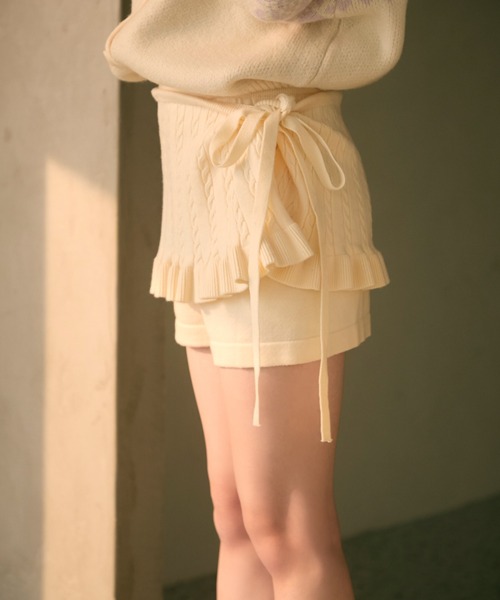 TITTY&CO.2025AW collection♡ニットの暖かさとフリルの甘さが両立した冬の優秀パンツ♡[detail]裾フリル付きのニットレースがアクセントになった、レイヤード風のニットショートパンツです。レース部分は取り外し可能で、シンプルなニットパンツとしても着回しが効く2WAY仕様です。伸縮性のある柔らかニット素材で、暖かさと快適な履き心地を両立した秋冬のマストアイテムです。--------------------------裏地:なし透け感:アイボリーややあり伸縮性:あり生地の厚さ:普通-------------------------- [styling]柄ニットカーディガンを羽織って、ガーリーでレトロな雰囲気のほっこりコーデに仕上げるのがおすすめです。レースを外して、ビッグスウェットやシャツワンピの下にインナーショーツ感覚で着用しても◎タイツやロングブーツを合わせて、防寒しつつトレンド感のあるY2Kコーデも楽しめます。※照明の関係により、実際よりも色味が違って見える場合がございます。また、パソコン・スマートフォンなどの環境により、若干製品と画像のカラーが異なる場合もございます。予めご了承くださいませ。※画像の商品はサンプルです。実際の商品と仕様・加工・サイズが若干異なる場合がございます。また、生産時期により、サイズやカラーに誤差が生じる場合がございます。予めご了承くださいませ。【商品のお気に入り登録】完売カラーの再入荷や、セール通知などお得な情報を受け取ることができます。ぜひご登録下さい♪【ブランドのお気に入り登録】新作入荷や再入荷、セールやクーポンイベントなど注目のブランド情報を受け取ることができます。ぜひご登録ください!!