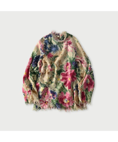 bouquetdeJardin想像の何倍も大きなお花を描いた甘織りのウールガーゼにぎゅぎゅ~っと縮絨をかけました。生地の目が詰まり、色合いは豊かにそしてさらにあたたかくなりました。ぽよんと愛らしいシルエット。ふわふわのフリンジがかわいい着丈長めのウールブラウスです。