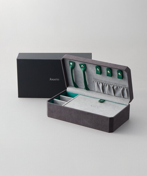 Jouete Mirage Box 洗練されたグレーとアクセントのグリーンが映える、モダンなジュエリーボックス。 上質感のあるデザインで、大切なジュエリーを美しく収納できます。 リングやピアスなどの小ぶりなアイテムはもちろん、バングルやアイウェアまで収納できるほど豊富な収納力が魅力的です。 内蓋と一体型のミラーが付属し、ドレッサーのようにその場でジュエリーコーディネートを組むことができます。 外箱付きで、特別感のある仕上がりです。 大切な方へのギフトやプレゼントにはもちろん、ご自身用としてもおすすめです。 ※数に限りがございます。予めご了承くださいませ ※ジュエリー・アイウェアは参考商品となります