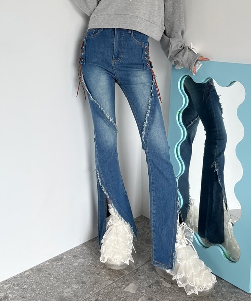 トレンドのレースアップデザインが可愛らしいデニムパンツ。 太もも部分はフィット、膝下から裾にかけて大胆に広がり、脚を長くすらっと見えるフレアになっていてすっきり見え◎ 程よいストレッチ感があり動きやすさもありつつ、ブーツでもスニーカーでも履くだけで細見えする着回し力抜群なパンツです。 ミニ丈topsやチュニックとも相性抜群! ********************** 透け感:なし 裏地:なし 伸縮性:あり 光沢感:なし 生地の厚さ:普通 ファスナー:あり ********************** 【ご注意】・画像の商品はサンプルとなります。 ・画像の商品は光の照射や角度、お客様のお使いのモニター設定、照明等により実物と色味が異なる場合がございます。 ・各アイテム・各サイズごとに代表一点を抜き出し採寸しておりますため、表示サイズと実物は若干異なる場合がございます。また、生地の種類等によっても少しズレが生じる場合があります。予めご了承ください。 ・ご注文が殺到した場合ズレが生じ欠品となる場合がございます。 ・ご注文確定後の変更・キャンセルは承っておりませんので予めご了承ください。《商品のお気に入り登録》♡をクリックして売り切れカラーの再入荷やセール情報の通知をメールでcheck!《ブランドのお気に入り登録》新作やお得な情報をいち早くお届けできます!ぜひご登録ください♡