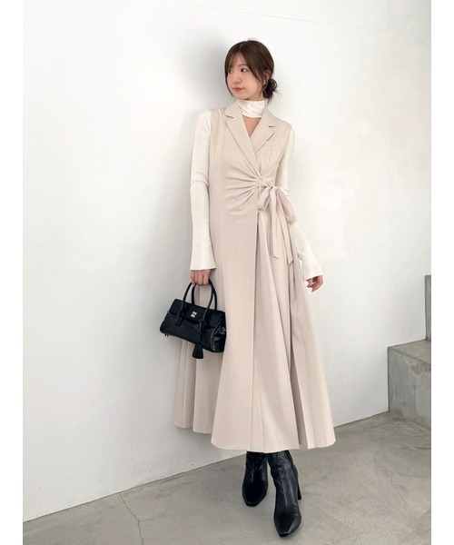 【サステナ素材を使用!洗練モードに格上げできるサイドプリーツテーラードワンピース】【Design/Styling】端正なテーラーカラーに、アシンメトリーなデザインを効かせ、左裾にはプリーツを入れてエレガントに仕上げたロング丈のプリーツテーラードワンピースが届きました。きちんと感のあるスーツ生地を使用し、フロント部分に今季らしいタックのディテールを入れてモードに仕上げているのもポイント。ウエスト位置は脇をリボンで結べるアシンメトリー仕様で、サイズ調整が少し可能です。長めのリボンが縦ラインを強調します。フロントはダブルの内掛けボタンで開閉ができ、裾が捲れないように、ストラップを付けて裾に留めデザインを入れているので、はだけるのを気にせずに安心してご着用頂けます。2WAYハイネックプルオーバー(SWNT255057)合わせがおすすめです。【Fabric】チャコールグレー、ライトベージュ、ブラウンの3色展開です。チャコールグレーとブラウンは杢見えに。ライトベージュはクリーンな色味です。【Recycled Polyester】使用後のポリエステル商品を粉砕し、糸や生地にアップサイクルさせた「POST CONSUMER」、工場での製造過程で発生する端切れや糸くずなどを使用する「PRE CONSUMER」をSNIDELでは使用しています。透け感;なし裏地;あり伸縮性;なし光沢感;なし生地の厚さ;普通【おすすめ骨格タイプ】■骨格ウェーブ■骨格ナチュラル※照明の関係により、実際よりも色味が違って見える場合があります。またパソコン・スマートフォンなどの環境により、若干製品と画像のカラーが異なる場合もございます。予めご了承ください。商品の色味は、商品単品画像をご参照下さい。 ※商品画像はサンプルのため、色味やサイズ等の仕様に変更がある場合がございますので、予めご了承ください。