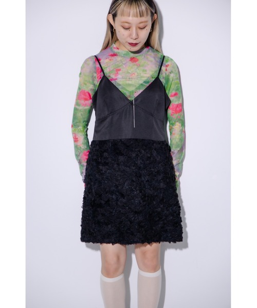 トレンド感のある着こなしが叶う■デザインランジェリーのディテールをイメージしたリボンが魅力のミニ丈ワンピース。スカート部分に使用したファーにテープ刺繍を施した素材感が目を引きます。肩紐は調節可能なのも嬉しいポイント。■コーディネート幅広いムードに対応するので、旬なニュアンスを取り入れたコーディネートが楽しめます。 ミニワンピースとしての着用はもちろん、パンツをレイヤードするのもおすすめ。上からニットやブラウスを重ねてスカート見えするスタイリングも◎。■サイズ身体のラインを拾いすぎない、綺麗なシルエット。インナーに薄手のカットソーやリブニットを着用できる程よいゆとりがあります。■素材艶やかで肉厚な高密度のサテン生地を使用。■ケア方法ドライクリーニングのみ可(詳細は商品についている品質表示ラベルをご覧ください)Model:H170 B78 W57 H88 Size:(画像の商品はサンプル用サイズのため実際のサイズ感と異なります)※光の当たり具合やパソコンなどの閲覧環境によって実際の色味と異なって見える場合がございます。予めご了承ください。※商品の色味は商品単体で撮影した画像をご参照ください。