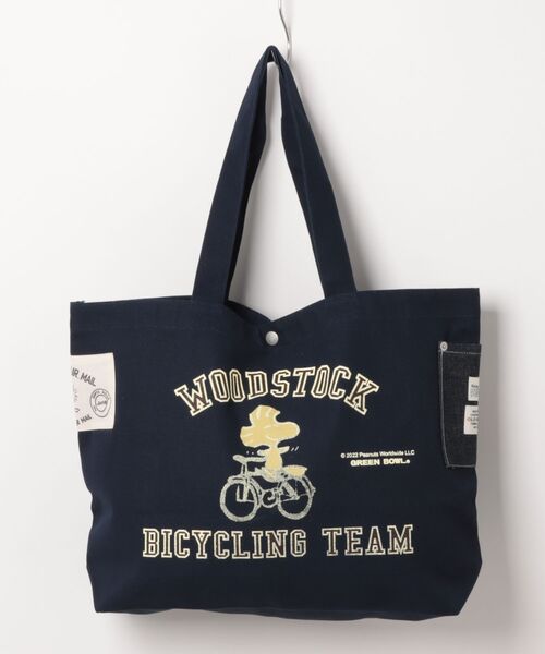 長い持ち手で肩掛けがしやすい、13Lの大容量トートバッグ。 重たいものを入れても安心感のある丈夫なキャンバス生地です。エコバッグとしてはもちろん、アウトドアやスポーツシーンなど、ハードな使用にも最適です。 バック口にはスナップボタン付きで、サイドにはデニム生地でポケットとプリントワッペンが付いてます。 表面にカラープリントと、裏面に単色プリントがアクセントになっています。 外ポケットx1