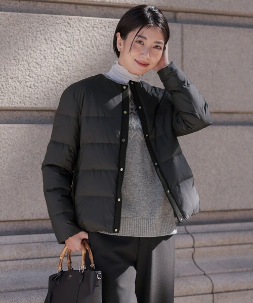 冬の始まりからさっと羽織れる、 暖かくて軽いノーカラーダウンジャケット ■デザイン コンパクトなサイズ感で、すっきりと着られるノーカラーダウンジャケット。シンプルなデザインに、前立てのグログラン素材とゴールド釦が、大人っぽくさりげないポイントに。異素材使いですがワントーンにまとめているので、カジュアルになりすぎず、幅広いスタイリングに活躍してくれます。これ1枚での着用はもちろん、防寒時にはオーバーサイズのコートインナーとしても着られ、汎用性の高い1着です。カラーは、明るく華やかな印象のアイボリー(#002)、落ち着いた雰囲気のモカグレー(#004)、べーシックでオンオフ兼用のブラック(#005)、柔らかな色味が女性らしいモカ(#030)の4色展開です。 ■素材 マイクロファイバーを使用した、高密度で上品なしなやかさを持つタフタ素材を使用。横方向にナチュラルストレッチ性があり、防風性と保温性を備えている素材になります。 ※商品画像はサンプルを使用しているため、色味やサイズ等の仕様に変更がある場合がございますので、予めご了承ください。 洗濯表示 【本体のみ】30℃まで弱洗濯可 漂白不可 60℃までのタンブル乾燥可 日陰つり干し乾燥 アイロンは120℃まで 弱いドライクリーニング(石油系)可 弱いウェットクリーニング可