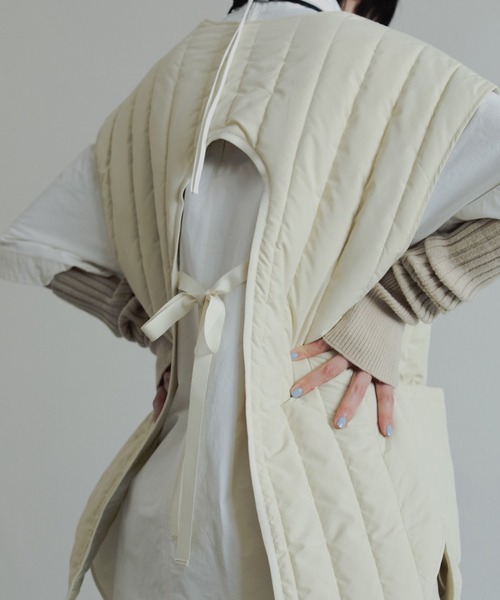 一点投入で日常のスタイリングを格上げ こなれ感漂うバックオープン中綿ベスト < デザイン・シルエット > ●シンプルなアイテムにレイヤードするだけで着映えるバックオープンキルティングベスト ●バックオープン仕様で後ろ姿に抜け感漂うお洒落感たっぷりな一着 ●太幅ストライプのステッチワークがアクセントに ●グログランテープのパイピングがデザインにメリハリが生まれます ●リボンディテールを前後にあしらいフェミニンな雰囲気をプラス ●中綿入りのキルティング仕様で立体感と軽いあたたかさを実現 ●ゆったりとしたサイジングでレイヤードスタイルにフィット します ●広めのアームホールでインナーやジャケットの上から重ね着可能 でロングシーズン着られます ●シンプルな見た目でキレイめにもカジュアルにも着回し自由なアイテムです ●単調になりがちな秋冬のプラスワンアイテムとしても◎ ●キレイめなスラックスはもちろん、デニムなどのカジュアルなボトムスと相性抜群◎ < 素材 > ●ポリエステル100%と、耐久性と軽さを両立したキルティング素材を採用 ●裏地の滑りが良くインナーへのひっかかりを軽減し、着脱がらくちん ●お家でお洗濯可能なので、デイリーに使えるもの嬉しいポイント! ---------------------------------------------------------------------- 透け感:なし 生地の厚さ:普通 伸縮性:なし 裏地:あり 洗濯方法:手洗い可 ---------------------------------------------------------------------- メーカー品番:62520108 【anuke/アンヌーク】 日常に寄り添うこと。 纏う人が前向きに生活すること。 それらを表現したものが、飾らないを意味する「anu」と抜け感の「nuke」を組み合わせた〈anuke〉のプロダクトです ★お買い物をよりお楽しみ頂く為にお気に入り登録がおススメです! ▼商品のお気に入り登録 商品ページ内のハートマーク♡をクリック。 完売時の再入荷や、最後の1点の通知、お得なお値下げの通知を受ける事ができます。 【お知らせ】ページでも通知が確認できます。 ▼ブランドのお気に入り登録 新商品や再入荷など、いち早くブランドのお得な情報を受け取ることができます。