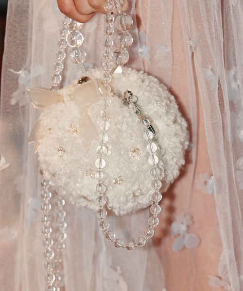 【アイテムポイント】 Rockfish Weatherwear × SUSAN FANG のコラボレーションラインとして、 SUSAN FANG ならではの幻想的でロマンチックな世界観を表現したハンドバッグです。 あたたかみのあるヘアリーな質感のファー素材と、コンパクトなラウンドシルエットが特徴。 透明感のあるフラワービーズとリボンディテールが、さりげない華やかさを添えます。 取り外し可能なビーズストラップにより、さまざまなスタイリングに対応し、 口金フレームで安定した使い心地を実現しています。 - SUSAN FANG コラボ限定・オリジナルジェリー素材のリボン装飾 - 取り外し可能なビーズクロスストラップ - フラワービーズ&ビーズハンドルディテール - 口金フレーム 【サイズ詳細】 - 縦の長さ(ビーズチェーン除く):14cm - 全長(ビーズチェーン含む):23cm - 横の長さ:14cm 【保管方法・取扱注意】 - 洗濯機洗い・乾燥機の使用はお避けください。 - 汚れた部分は、柔らかい布で軽く拭き取ってお手入れしてください。 - ビーズ部分は衝撃に弱いため、強い力を加えないようご注意ください。 - ファーの毛並みが寝たり絡まった場合は、柔らかいブラシで軽く整えてください。 - ビーズおよびチェーン部分は湿気に弱いため、保管の際は乾燥した風通しの良い場所をおすすめします。