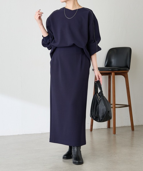 ビーズラインが品よく華やぐ、きちんとシーンにも頼れるセットアップ【POINT】・きちんと見えする素材なので、コサージュやブローチなどアクセサリーを合わせてセレモニー、ご家族行事にも対応可能です。・ソフトなハリのある風合いと適度な生地の膨らみで肉感のある生地となり、軽やかでロングシーズン着ていただけます◎・スカートは腰回りにタックを入れることですっきり見え叶います◎・ストレッチの効いた生地なのでストレスフリーに着れるのも嬉しいポイント◎【おすすめコーディネート】グレージュ:明るく優しいベージュはきれいめブラウスと合わせた大人フェミニンスタイルもおすすめです。ネイビー:合わせやすく落ち着いたネイビーは1枚あるときちんとシーンで活躍します。【おすすめのスタイリングアイテム】・シャーリングドットブラウス CLZ1052604A0002【素材】《ブラウス》本体:ポリエステル92%, ポリウレタン8%リブ部分:ポリエステル92%, ポリウレタン8%《スカート》表地:ポリエステル92%, ポリウレタン8%裏地:ポリエステル100%透け感:なし裏地:ベージュのスカートのみペチコート付き伸縮性:あり光沢感:ありおすすめ着用時期:秋、冬、春洗濯:手洗い可≪返品・交換について≫・着用後、洗濯後の返品・交換は致しかねます。・商品到着後、着用前に商品状態のご確認をお願い致します。・ECサイトでご購入いただいた商品は、お修理を承っておりません。【気になる商品は「お気に入り」登録を】ハートマークをクリックし、お好きなカラーを選んでお気に入りに登録すると入荷情報や残り1点の通知、完売カラーの再入荷、セール情報などを受け取ることができます。※撮影場所やお使いのモニター環境により若干お色味が異なる場合がございます。特にロケの撮影では明るく見える傾向にございます。詳細撮影画像で色味をお確かめくださいます様お願いいたします。※サンプルで撮影をしております。若干の仕様が変更になる場合がございますので予めご了承の上ご注文くださいますようお願いいたします。※サンプルでの採寸のためあくまで目安となります。予めご了承ください。
