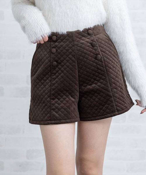 冬映えする上品フェミニン!クルミボタンキルティングショートパンツ【デザイン】柔らかなキルティング素材が季節感を添えるショートパンツ。立体的なステッチと共布のクルミボタンが、上品でクラシカルな印象を演出します。ハイウエストのシルエットで脚長効果も抜群。厚みのある生地感ながらも軽やかに穿けるので、冬のフェミニンコーデにぴったりな一枚です。タイツやロングブーツとの相性も良く、甘さと大人っぽさを両立したシーズンスタイルを楽しめます。【素材感】着心地の軽いポリエステル素材伸縮性:なし/ 透け感:なし / 裏地:なし/ ウエストゴム:あり 水洗いによる洗濯不可 / ドライクリーニング可【コーディネート】リブニットやボウタイブラウスをインして、ショートブーツを合わせれば、上品な大人フェミ二ンコーデに。ショート丈のボアブルゾンやミドルコートを合わせて、季節感のある抜け感コーデに。【※お取り扱い上のご注意】1:モニター環境等により実際の商品と多少色味が異なって表示される場合がございます。予めご了承下さい。2:屋外で撮影された商品は、天候により多少実際のカラーと異なる場合があります。商品のカラーはトルソー(マネキン)の商品画像をご参照ください。3:濃い色の商品は、お洗濯や摩擦等による移染にご注意ください。4:末永くご愛用頂く為に、アテンションタグ・洗濯ネームを必ずご確認の上、着用又はお取り扱い下さい。5:生産時期により、色、サイズ、デザイン、素材の質感が多少が異なる場合がございます。あらかじめ御了承下さいませ。