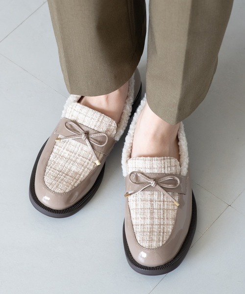 エナメル素材と、柄生地をコンビ使いにしたローファーシューズ。 こだわりの金具と、色ごとに異なる質感の生地を使用したカラーバリエーションです。 リボンとゴールドカラーのパーツでフェミニン要素もさりげなくプラス。 インナーにはふわふわのシープボアを使用しました。 履いた時にもファーがちらっと見え、シーズンムードを盛り上げてくれる1足です。 ※撮影は室内で行われており、ライティングにより実物と色味が少し異なる場合がございます。 ※柄の商品は左右で模様が異なる場合がございますので予めご了承ください。
