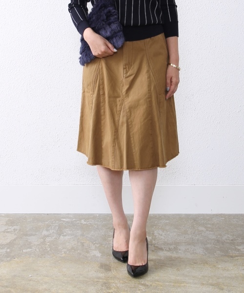 フェミニンさをキープしたカーゴミディスカートが登場! ハリ感のあるコットンカルゼ地がデイリー使いに最適です。 切替えによるナチュラルなフレアラインが、大人可愛いアイテムです。 ナチュラルなカットオフ仕上げが程良いこなれ感をプラス! さりげなくプラスされたフラップポケットがバックスタイルを引き締めます。 ハードになりがちなミリタリーアイテムをタウンユースにアップデートした1枚! 店舗にお問い合わせの際は、全国のコーエン各店まで下記の品番をお申し付け下さい。 品名:B C/カルゼ カーゴ MD SK 品番:7670-634-5054