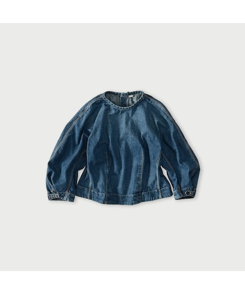 サクッと香ばしいデニムライ麦よりもっと軽い、麦比古はドライタッチのライトオンスデニム。凹凸感と濃淡はそのままに、焼きたてパンのような軽やかな着心地を実現しました。たくさん着込んだような、アタリや色落ち。青が鮮やかなインディゴ加工を作りました。まるいかたちから生まれたパフっとした袖が女の子らしい立体的なブラウスです。