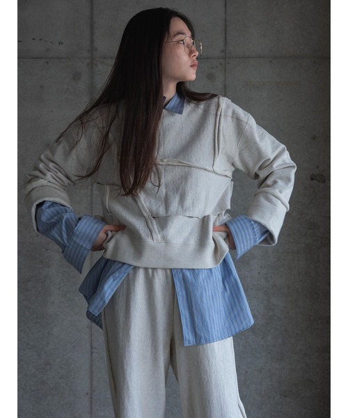 k3&co.(ケイスリーアンドコー)スウェットピーストップ【Fabric】しっかりとした厚みのあるコットンを100%使用。【Design】23AWで人気を博したパッチワークデザインのニットがスウェット生地で再登場。カラーはIVORYとBLACKの2色をご用意。大胆に施されたパッチワークデザインで、大人の遊び心を演出します。動いた時にチラリと肌を見せたり、インナーを見せたりと遊べる一枚。Side raw edge slit pantsとのセットアップコーデもおすすめ。[SET UP ITEM]K32533008 Side raw edge slit pants※照明等の条件により写真と実際の商品とは色味、サイズ等若干異なる場合があります。予めご了承ください。ご利用いただいているモニターの環境によって色が再現できない場合がございます。