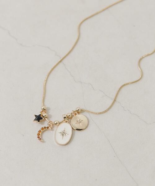 【キラキラチャームで気分上がる!マルチチャームネックレス】●月、星、コインなど、様々なラッキーモチーフを贅沢に配置●きらりと光るビジューがアクセント●シンプルなトップスのアクセントに映える三日月や星、コインなど、見ているだけで楽しくなるような様々なチャームをあしらったネックレス。小さなメタルボールやビジューの輝きが、首周りに表情を加えてくれます。程よいボリューム感で、コーディネートの主役になるアイテムです。【2025 Autumn/Winter】【25AW】※メッキ製品(特に銀メッキ)は変色しやすいため、こまめなお手入れで防止してください。長期放置やスプレー香料などの同時使用は、特にお避けください。※メッキ製品は、アレルギー体質の方や体調が低下している方など、かぶれることがあります。肌に異常を感じた時はご使用をお止めいただき専門医にご相談ください。※アクセサリーは壊れやすいものです。取り扱いに注意していただき大切にご使用いただけるようお願い申し上げます。総重量 : 約7g※商品画像は、光の当たり具合やパソコンなどの閲覧環境により、実際の色味と異なって見える場合がございます。予めご了承ください。※商品の色味の目安は、商品単体の画像をご参照ください。▼お気に入り登録のおすすめ▼お気に入り登録商品は、マイページにて現在の価格情報や在庫状況の確認が可能です。お買い物リストの管理にぜひご利用下さい。-