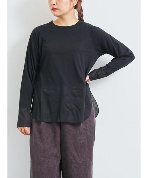 異素材の布帛切替がさりげなく映えるロングTシャツ。 軽やかな透け感が抜け感を演出し、デニムと合わせれば大人カジュアルに、スカート合わせで上品な印象に。 シンプルながらデザイン性があり、1枚でもレイヤードでも活躍する万能アイテムです。 ※商品画像は、撮影環境やお客様のご利用のPC・スマートフォンのモニター環境などにより実物と色味に差異がある場合がございます。