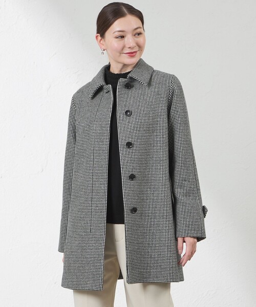 大人のための千鳥柄ウールコート【デザイン】「AMACA×SANYOCOAT コラボコート(V5A01-600)」のシルエットをベースにウール仕様にアレンジを施した、パンツにもスカートにも合わせられるコートです。袖裏にはストライプの裏地を使い、見返し端にはサテンのパイピングを施す等、細かいディテールもうれしいポイント。同じ形で素材違いのご用意もございます。(V5B04-650)【素材】AMACAオリジナルの柄を織り上げた千鳥見えの素材。Super100’sのウールを使用し、主張しすぎない大きさ・色にこだわり、柄物でも着用しやすいのがポイントです。