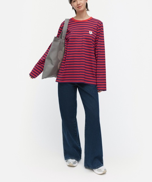 『Marimekko Kioski』 マリメッコのアイコン的プリントを再解釈し、無限のワードローブを提案するジェンダーニュートラルなストリートウェア Marimekko Kioski(マリメッコ キオスキ)。 「他人の真似はせず、自分らしく」をキーワードに、作り物ではないオーセンティックなスタイルを追求したコレクション。 【テキスタイルデザイン:Annika Rimala(アニカ・リマラ)】 Tasaraita(タサライタ):ボーダー 【テキスタイルデザイン:Maija Isola(マイヤ・イソラ)】 Unikko(ウニッコ):花 2色のボーダー柄が着こなしの華やかなアクセントになるOネック長袖カットソー。平等性を表現しているMarimekkoのボーダー柄。左胸のUnikko柄の小さなフラワーモチーフがスタイリッシュなワンポイント。ユニセックスなサイズ感もモダンなポイント。明るいムードのスタイリングが実現するアイテムです。 ※品質表示は、Marimekko社の付けた洗濯表示を日本国内の基準に合わせ付け替えております。本国のタグはカットされておりますので、予めご了承ください。 ※断裁により商品ひとつずつの柄の出かたが異なるため、表示画像のディテールと多少異なるデザインのものが届く場合がございます。予めご了承ください。 モデル着用サイズ:M/038/004