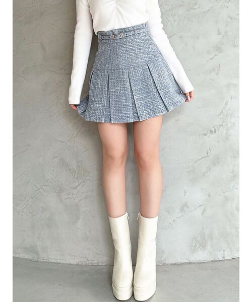 春らしいツイード生地のプリーツスカート▽デザイン▽大人気のツイードプリーツミニスカートが今年も登場!ラメ糸が織り交ぜられているツイード生地を使用し、贅沢感溢れる一着に。ハイウエスト+ベルトでウエストラインをしっかり引き締め、程よいAラインシルエットがスタイルアップ効果抜群◎インナーパンツ付きなので安心して1枚で着用していただけます。▽カラー▽白・青・ピンクの3色展開。▽スタイリング▽同素材のツイードジャケットとのセットアップ着用がおすすめ♪今季はミディ丈・クロップド丈でお選びいただけます。ツイードがコーデに映えるのでシンプルなニットやブラウス合わせもおすすめです◎【セットアップアイテムはコチラ】>>ツイードミディジャケット>>ツイードクロップドジャケット