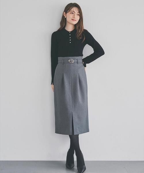 【すらりと美しく、品よく決まるタイトスカート】 【Point】 ・すっきりとしたIラインシルエットが美しい、上品な印象のスリット入りタイトスカート。 ・ハイウエストデザインが腰位置を高く見せ、スタイルアップ効果も抜群です。 ・フロントスリットで抜け感を演出し、動きやすさとこなれ感を両立しました。 ・ウエストのバックルがさりげないアクセントになり、シンプルながらも女性らしいメリハリをプラス。 ・ブラウスを合わせてきれいめに、ニットを合わせて大人フェミニンにも着こなせるアイテムです。 ケア方法:手洗い 透け感:なし 裏地:あり 伸縮性:なし 光沢感:なし 生地の厚さ:中肉 M:(01):着丈 78㎝/ウエスト 64㎝/ヒップ 98㎝/裾回り 46.5㎝ (02):着丈 80㎝/ウエスト 67㎝/ヒップ 101㎝/裾回り 48㎝ S:(01):着丈 78㎝/ウエスト 64㎝/ヒップ 98㎝/裾回り 46.5㎝ (02):着丈 80㎝/ウエスト 67㎝/ヒップ 101㎝/裾回り 48㎝