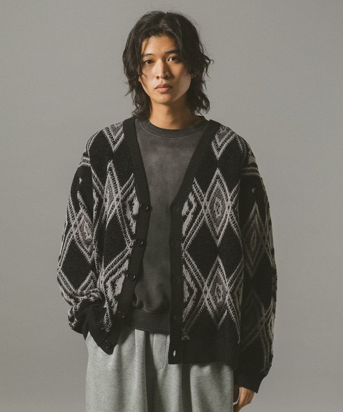 もちもちとしたモールニットを使用 ーーー ■ポイント トラッドな印象が特徴のアーガイル柄をあしらったニットカーディガン。 太モール糸で編み立てることで、もちもちとした柔らかな肌触りを実現。 Vネックデザインにしているので、顔周りがすっきりと魅せられます。 程よいオーバーサイズで仕上げ、一枚着としてもインナーとしても重宝します。 ■素材 ふっくらとした厚みが特徴のモールニット素材を使用。 上品な光沢が高級感を作り出しますが、ご自宅洗濯可能でイージーケア仕様。 ウールが入っていないので、ニットにありがちなチクチク感もなく、ストレスのない着心地をお楽しみ頂けます。 ジャガード織りで仕立てているので、立体感や凹凸があり奥行きのある表情が生まれます。 ====== ■参考サイズ M:~175cm L:175cm~ ====== ーーー