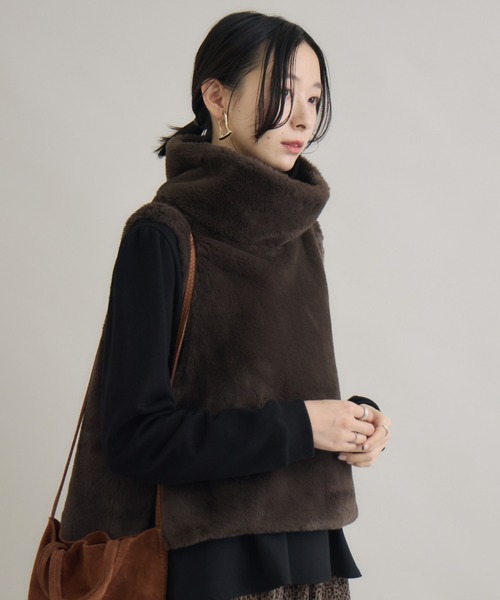 スタイルも気分もアップデートするファーベスト <POINT> ふんわりと包み込む、極上の柔らか素材。 ハイネックが生み出す上品な印象。 デイリーにも特別な日にも映える万能デザイン。 【デザイン・シルエット】 顔まわりをすっきり見せるハイネックデザインが、シーズンムードを一層引き立てます。 シンプルなインナーに合わせるだけで、こなれ感のある大人のスタイルが完成。 両サイドに配されたゴールドボタンが、ファーベストに上品な輝きをプラス。 ボタンを留めればすっきりとした印象に、外せば抜け感のあるリラクシースタイルに変化。 【素材感】 まるで毛布のように柔らかく、思わず触れたくなる滑らかなポリエステル素材を使用。 軽やかな着心地ながら、しっかりと暖かさを感じられる一着。 【カラー】 ブラック モカ グレイッシュベージュ 3色展開 【スタイリング】 タートルネックニットに重ねて、上品なレイヤードスタイルに。 ワンピースの上から羽織って、季節感と立体感をプラス。 裏地:あり 光沢:あり 伸縮性:なし 透け感:なし 生地の厚さ:やや厚手 ポケット:なし 【CYAN】 Authentic Elegance / オーセンティックエレガンス シンプルライフを好むエフォートレスな女性へ向けた ほんの少しのデザインスパイス。 上品な大人のデイリースタイルを表現いたします。 ※照明の都合上、多少の色ブレが生じてしまう可能性がございますので、予めご了承くださいますようお願い致します。 --------------------------------------------------- ●お気に入り登録でお得情報を手に入れよう! 「商品のお気に入り登録」をすると、再入荷通知や、ラスト1点の通知、セールの通知など、お得情報が届きます。 また、マイページでいつでも確認が可能になります。 「ブランドのお気に入り登録」をすると、新商品や再入荷、などいち早くブランドの最新情報をお届けします。 ぜひ、ご利用ください。 ----------------------------------------------------