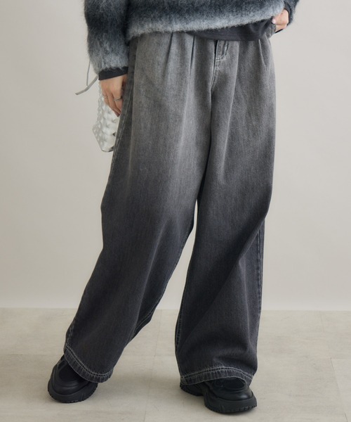 色の濃淡で魅せる、美脚シルエットのワイドパンツ <POINT> グラデーションが描く美しい陰影デザイン。 ワイドシルエットで叶える抜け感と美バランス。 ヴィンテージライクな風合いが魅力。 単品で手洗い可能な仕様で、お手入れも簡単。 【デザイン・シルエット】 上から下へと自然に深まるカラーグラデーションが、脚のラインをすっきりと見せるデザイン。 程よくゆとりのあるワイドシルエットが、体のラインを拾わず美しいドレープを形成。 股上深めのデザインで、腰位置を高く見せてスタイルアップ効果も◎ フロントに施されたタックが、シルエットに立体感ときちんと感をプラス。 【素材感】 綿100%ならではのナチュラルな質感と、ビンテージライクな色味が絶妙にマッチ。 履くほどに柔らかくなじみ、経年変化も楽しめます。 【カラー】 ブラック ブルー 2色展開 【スタイリング】 オーバーサイズニットを合わせて、抜け感のある大人カジュアルに。 テーラードジャケットを羽織れば、上品なモードスタイルに。 裏地:なし 光沢:なし 伸縮性:なし 透け感:なし 生地の厚さ:普通 ポケット:あり ※照明の都合上、多少の色ブレが生じてしまう可能性がございますので、予めご了承くださいますようお願い致します。 ※サイズ表記はブルー・ブラックどちらも「FREE」となっておりますが、カラーによって実際のサイズが異なります。 ブルー:Sサイズ相当 サイズ:ウエスト67cm/ヒップ102cm/股上35cm/股下71cm/総丈103cm/もも周り74cm ブラック:Mサイズ相当 サイズ:ウエスト70cm/ヒップ104cm/股上35cm/股下71cm/総丈103cm/もも周り76cm --------------------------------------------------- ●お気に入り登録でお得情報を手に入れよう! 「商品のお気に入り登録」をすると、再入荷通知や、ラスト1点の通知、セールの通知など、お得情報が届きます。 また、マイページでいつでも確認が可能になります。 「ブランドのお気に入り登録」をすると、新商品や再入荷、などいち早くブランドの最新情報をお届けします。 ぜひ、ご利用ください。 ----------------------------------------------------