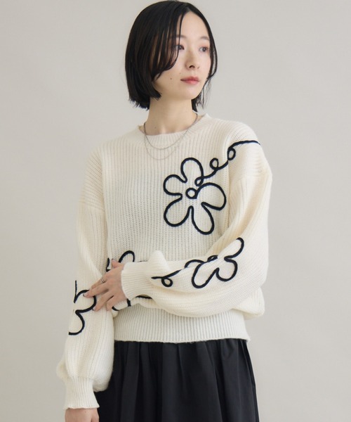 一枚で着映える、大人フェミニンなコード刺繍プルオーバー <POINT> 立体感のあるフラワーコードが映えるデザイン。 ふんわりシルエットが叶える抜け感。 デイリーケアが簡単な“手洗い可能”仕様。 【デザイン・シルエット】 フロントと袖にあしらわれた大きめのフラワー柄コード刺繍が、女性らしい華やかさを演出。 繊細ながらも主張しすぎないデザインで、柄物が苦手な方にも取り入れやすい一枚です。 袖幅をたっぷりと取ったぽわんとしたシルエットが、程よいゆとりとトレンド感をプラス。 【素材感】 ポリエステル100%の厚手素材を使用し、保温性に優れた仕上がり。 軽やかなのにしっかり暖かく、秋冬の外出シーンに最適。 【カラー】 ブラック ホワイト ブルー 3色展開 【スタイリング】 デニムパンツと合わせて、抜け感のある大人カジュアルスタイルに。 フレアスカートで女性らしさを引き立てる、やわらかな印象のコーデに。 裏地:なし 光沢:なし 伸縮性:あり 透け感:なし 生地の厚さ:厚手 ポケット:なし ※照明の都合上、多少の色ブレが生じてしまう可能性がございますので、予めご了承くださいますようお願い致します。 --------------------------------------------------- ●お気に入り登録でお得情報を手に入れよう! 「商品のお気に入り登録」をすると、再入荷通知や、ラスト1点の通知、セールの通知など、お得情報が届きます。 また、マイページでいつでも確認が可能になります。 「ブランドのお気に入り登録」をすると、新商品や再入荷、などいち早くブランドの最新情報をお届けします。 ぜひ、ご利用ください。 ----------------------------------------------------