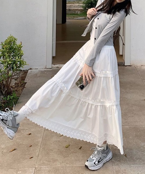 ティアードデザインと裾のレースがポイントのロングスカートです。 ウエスト部分はゴムになっているのでノンストレスで着脱もラクチンです♪ さらっとした素材なのでオールシーズン活躍します。 トップス次第でフェミニンコーデにもカジュアルコーデにも◎ ‥‥‥‥‥‥‥‥‥‥‥‥‥‥‥‥‥ 透け感:有 ファスナー:無(ウエスト部分ゴム仕様) 厚さ:普通 サイズ感:ゆったり 着丈:ロング丈 ‥‥‥‥‥‥‥‥‥‥‥‥‥‥‥‥‥ ●サンプル品を使用している事もあり、サイズ感など多少異なる場合もございます。 ●パソコンのモニター、撮影の光量などにより画像と実物の色味が異なって見える場合がございます。 ●入荷時期・追加生産により画像・詳細と多少異なる場合がございます。 ■商品によって生地の他繊維の混紡、縫製の多少のほつれなどがある場合がございます。