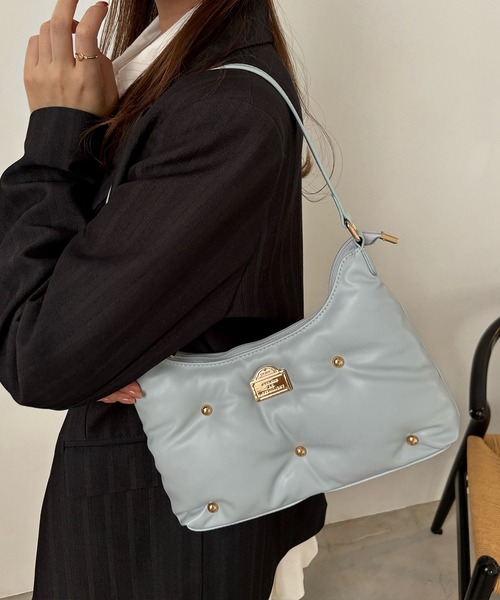 【mytwilight PARIS mood collection】 パリ市内の標識をモチーフにしたゴールドの金具がポイントのアイテム。 中綿入りでソフトなパフ感とゴールドのスタッズの組み合わせがかわいいバッグです。 流行のハーフムーンシルエットで肩掛けしやすく、すっきり見えします。 柔らかい合皮を使用しているため伸縮性があり見た目以上に大容量です。 内ポケットも2つあり、使い勝手の良い仕様に仕上げました。 【ご注意】 ・画像の商品はサンプルとなります。 ・画像の商品は光の照射や角度、お客様のお使いのモニター設定、照明等により実物と色味が異なる場合がございます。 ・各アイテム・各サイズごとに代表一点を抜き出し採寸しておりますため、表示サイズと実物は若干異なる場合がございます。また、生地の種類等によっても少しズレが生じる場合があります。予めご了承ください。 ・ご注文が殺到した場合ズレが生じ欠品となる場合がございます。 ・ご注文確定後の変更・キャンセルは承っておりませんので予めご了承ください。