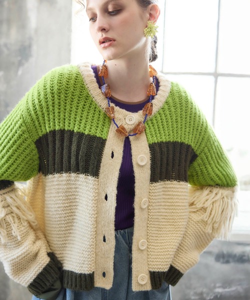 MARECHAL TERRE / フリンジニットカーディガンお袖のフリンジがコンシャスなデザインのカーディガン。 ざっくりと編まれたニットは温かみがあり、ほっこりとした気分にさせてくれます。 マルチカラーの色の配色がオシャレ度が高い印象を与えてくれます。 着丈が短めなのでお袖とのバランスが絶妙でシルエットも◎ 大き目のボタンもアクセントに♪ -------------------------------------- 透け感:なし 裏地:あり 伸縮性:ややあり ケア方法:手洗い可 ※お洗濯の際は洗濯表示を必ずご確認ください。 -------------------------------------- <コーディネートmodel172cm> <コーディネートmodel160cm> <詳細画像model162cm> [MARECHAL TERRE / マルシャルテル] 着る人を「凛」とさせる服作りをコンセプトに「Traditionalを遊ぶ」、トラッド・カジュアル・エレガント・モードを少しだけ捻ったデザインで30代のリアルクローズを提案。 着る人が心を動かされる物作り、シンプルで心地よく女性に共感を得ることを服作りのVISIONに。