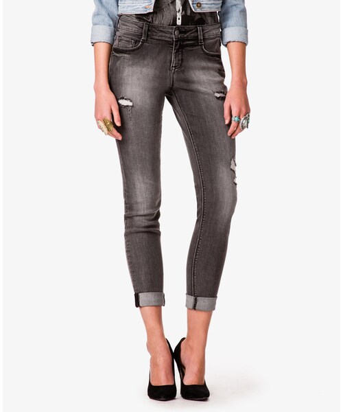A pair of whiskered distressed skinny jeans Zip fly with button closure. Five-pocket construction. Tonal top stitching. Belt loops. Stretch fit. Woven. Lightweight. DETAILS: 29.5" approx. inseam, 29" waist, 10" leg opening, 8" rise, 18" thigh girth Measured from Size 25 73% cotton, 14% rayon, 2% spandex Machine wash cold, tumble dry Imported