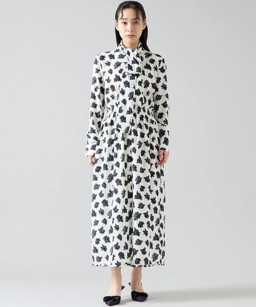 華やかなオールドローズプリントを生かした バンドカラーのシャツドレスはジョーゼットがクラシックなムード。 ウェストシャーリングが全体を引き締めてくれます。 同素材のボウリボンは襟元だけでなくウェストリボンとしてのアレンジも可能。 シャツドレスとしてだけでなく、ボタンを開けてデニムパンツとレイヤードした カジュアルミックスのスタイルも新鮮です。 ヨーロッパで60年代に描かれた薔薇のスケッチをもとにした TIARAオリジナルのオールドローズプリントは 手書きならではの繊細なタッチが魅力です。 生地は季節を問わず楽しめ、 シワにもなりにくいポリエステルジョーゼットを使用。 *アイテムによって柄の大きさを変えています。 ■透け感 なし(ホワイトはややあり) ■伸縮性 なし ■光沢感 なし ■裏地 ペチコート ■生地の厚さ やや薄い