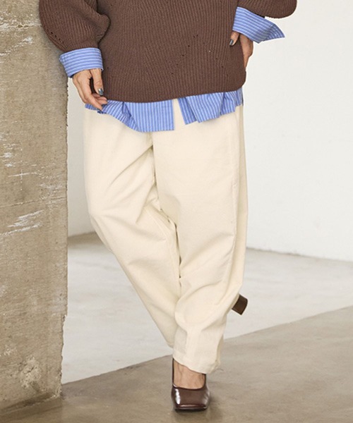 ルーズ感を出したシルエットが新鮮な一着 カジュアルから綺麗めまで幅広い着こなしにおすすめなストレートパンツ ーーー 【素材】 秋らしいコーデュロイを使用。 軽く柔らかな風合いの素材感です。 【デザイン】 ルーズなシルエットが新鮮なストレートパンツ。 股上を少し長めに設定し、腰回りはすっきりとしたデザイン。 カジュアルすぎず、脚を長く見せてくれるので綺麗めな着こなしとも好相性です。 ボトム パンツ ストレート イージーパンツ ーーー 【スタイリング】 シャツやスウェット、ニットを合わせたカジュアルな着こなしがおすすめ。 ブラウスやフリルトップスなど女性らしいアイテムとの合わせも素敵に決まります。