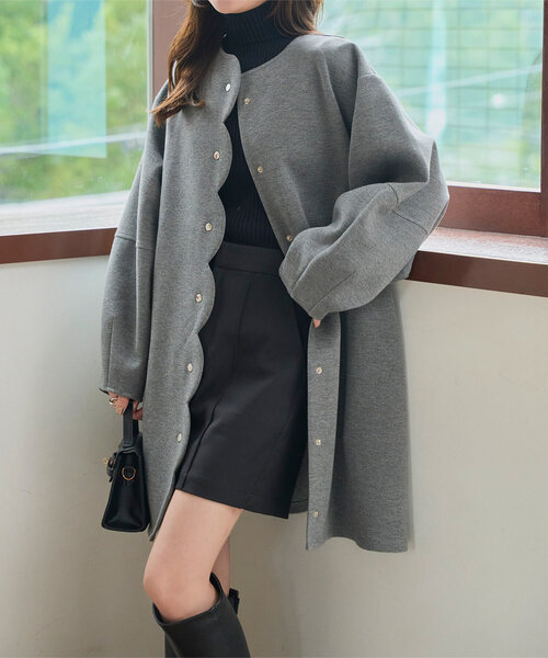 ふんわりとしたボリューム感と立体的なフォルムが魅力のダイバー素材スカラップコート。フロントのスカラップデザインが目を引き、シンプルな中にも女性らしい華やかさを添えてくれます。羽織るだけで上品な印象を演出し、通勤・オフィスカジュアル・お出かけなど、さまざまなシーンで活躍。秋から冬、そして春先までロングシーズン頼れる一着として、ワードローブに加えておきたいアイテムです。【素材・サイズ感】ゆったりとした身幅で、中にニットや厚手のトップスを着ても窮屈感のない着心地です。膝上ほどの着丈でバランスが取りやすく、パンツにもスカートにも合わせやすい万能な丈感。肩や腕まわりにほどよいゆとりがあるため、レイヤードしやすく秋冬の防寒アウターとしても◎広がりすぎないAラインシルエットが、体型をさりげなくカバーしつつすっきりと見せてくれるのも嬉しいポイントです。【STAFFコメント】スカラップデザインが大人可愛いミディコート。ランタンスリーブがお洒落アクセントに。スナップボタンを閉めてロングブーツとミニワンピ風コーデもおすすめです。ノーカラーなのでハイネックニットとのレイヤードも◎シンプルな無地アウターでデイリーに使いやすいデザインです。《KOBE LETTUCE ー神戸レタスー》 プチプラレディースファッションからコスメまで、トレンドアイテムを豊富に取り揃えております。 毎シーズン発売されるインフルエンサーとのコラボ商品はSNSでも話題に。