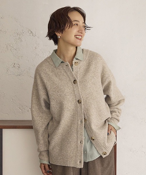 着回し力抜群な前後2WAY仕様着心地の良いノンストレスなニットカーディガンーーー【素材】ウールブレンドされた素材を使用。軽くて膨らみのある、ふっくらとした風合いが特徴です。【デザイン】7ゲージで作成されたウールミックス素材のカーディガン。素材を活かしたミニマムデザインだからこそ、前後2WAY仕様で着回し力のある一着に。肌触りが良く着心地も良いのでノンストレスなのも嬉しいポイントです。トップス ニット カーディガン 2WAYーーー【スタイリング】ボトムスを選ばず幅広い着こなしが楽しめる一着。デニムやワイドパンツ合わせのカジュアルな着こなしや、ナロースカートやフレアスカート合わせの女性らしい着こなしがおすすめです。レイヤードしやすいクルーネックなので、襟に高さやデザインのあるインナーを合わせていただくのも◎