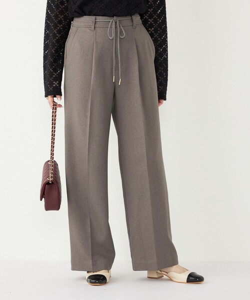 ■25AW■ご好評のウールライクパンツに、新色ベージュが登場!-デザイン-カジュアルにもきれいめにも合わせやすい、センタープレス入りのワイドシルエットパンツ。ゆったりとしたシルエットに加え、ウエスト後ろはゴム仕様で、ストレスフリーな履き心地です。フロントの紐先にはゴールドカラーの金具あしらい、上品なアクセントに。お手持ちのベルトを合わせていただくことも可能です。-素材-ウール見えする素材感ながら、ポリエステル100%でさらりとした肌触り。裏地のない仕立てで、長いシーズンを通して活躍してくれます。-コーディネート-ブラウスと合わせたきれいめスタイルから、カットソーやスウェットと合わせたカジュアルスタイルまで幅広く着回せます。同素材のジャケットとのセットアップスタイルは、フォーマルなシーンにもおすすめです。一部カラーは同素材のシリーズでジャケットとベストのご用意もございます。ジャケット品番:227-07-0005ベスト品番:224-76-0004※モールサイトによって(ハイフン/-)抜きでの品番表記となります。------------------------------生地の厚み:中間伸縮性:無透け感:無光沢感:やや有水洗い:手洗い可------------------------------※適度な力や摩擦が加わると、縫い目の滑脱、生地の擦り切れや破れ、生地の変形が生じますのでご注意ください。※末永く愛用頂く為に、アテンションタグを必ずご確認の上、着用又はお取り扱いください。※商品の色味は、物撮りの詳細画像をご参照ください。※画像の商品はサンプルです。実際の商品と仕様、加工、サイズが若干異なる場合がございます。※こちらの商品はアウトレットのオリジナルレーベル商品です。SHIPS OUTLET各店、ECサイトでの取り扱いとなります。店舗へお問合せの際は、全国のSHIPS OUTLET各店までお願いいたします。その他のSHIPS各店舗へのお取り寄せ対応は致しかねますので、予めご了承の程お願いいたします。□SHIPS ColorsSHIPSのコンセプト「STYLISH STANDARD」のフィルターを通して、カジュアルからビジネスまでのアイテムをリーズナブルなプライスで構成したオリジナルレーベルです。メンズ、ウィメンズ、キッズをラインナップし、OUTLET各店舗、ECサイトを中心に展開。様々なライフスタイルに寄り添い、自分らしさを表現できるトータルアイテムを提案します。