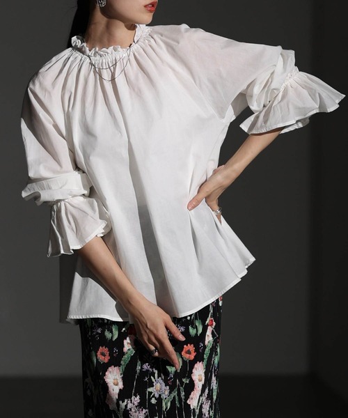 【アイテム】 オンオフ問わす使えるブラウスはクローゼットに加えてほしい万能アイテム。袖口のベルスリーブデザインはベーシックなブラウスに女性らしいシルエットをプラス! 【シーン】 お出かけ、旅行、ランチ、女子会、オフィス、レジャーに活躍します。 【体型カバー】 ゆったりとしたシルエットで二の腕、ウエスト、ヒップの体型カバーができます。 【Sサイズスタッフ着用コメント/40代150cm】 着丈は太ももの付け根より10cmくらい下です。袖は伸ばすと手がすっぽり隠れますが手首ラインにゴムが入っていてギャザーのフリル袖になっているのでブラウジングして自分の好みの位置で着用できます。首元は後ろボタンのフリルのプチハイネックで余裕がありました。首元からギャザーが入っているのでふんわりと体型をカバーして楽に着用できました。少し透け感のある綿100%の生地で肌触り良かったです。 ※お使いのディスプレイにより色味が異なって見える場合がございます。ご了承の上お買い求め下さい。 ※他のキャンペーンにより、期間中に価格が変動する場合があります。 ☆『お気に入り登録』でお得な情報がいっぱい☆ ■「商品のお気に入り登録」で再入荷通知や、在庫残り僅かの通知、セール通知も受け取ることができます。 ■「ブランドのお気に入り登録」で新商品や再入荷など、お得な情報を受け取ることができます! 是非ご登録くださいね☆