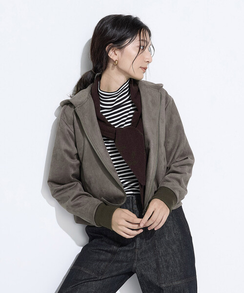 《デザイン》クロップド丈のパーカブルゾンで、ぷるんとハリ感のあるダンボール素材はストレッチ性があり、快適な着心地です。コートを着る前のアウターとして、また冬はコートインでフードを出す着こなしで長いシーズン活躍します。袖口は同色のニットリブでブルゾン用に仕立て、裾はリブを付けないことで裾は絞らず、すっきりとしたシルエットにしています。《素材》リサイクルポリエステルを使用したエコセンシカルダンボールスエードで、GRS認証を取得しているメーカーと開発した持続可能な素材です。裏面が滑らかなジャージー素材で肌触りが良く、着心地が良いのも特長です。お手入れ方法:手洗いOK