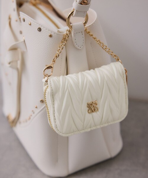 【2025 Autumn/Winter】【25AW】 <POINT> ・ICカードやクレジットカードが入るポーチ型 ・リップやAirPods、常備薬を入れるのもおすすめ! ・両サイドに落下防止のマチがついているのも嬉しいポイント。 ・バッグチャームとしてお手持ちのバッグやスマホショルダーにつけると、とっても可愛いです! ※チェーンは片側だけ外れる仕様です。 【デザイン・シルエット】 エレガントな表面加工とロゴプレートで高級感がプラスされ、デザイン性も機能性も両方こだわったポーチ型チャームです。 【素材】 合成皮革 【カラー】 ブラック、キナリ、サックスの3色展開。 【おすすめのスタイリング】 スタッズとラインストーンがハート型に施されたハート型バッグ(品番:BVX45240)や、キルティングショルダーバッグ(品番:BVX45110)に付けるとコーディネートのアクセントとして、より一層可愛らしさが引き立ちます。 ----------------------------- 収納可能 ICカード・クレジットカード リップ、AirPods、アクセサリー、お薬、キャンディーなど ※すべて一緒には入りません ----------------------------- ※画像の商品はサンプルです。実際の商品と仕様、加工、サイズが若干異なる場合がございます。