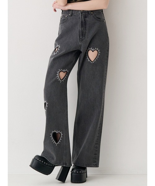 前回大人気だったハートカッティングデニムの今季バージョンです。カッティング部分のまわりにビジューをつけてアップデートしています。キラッと光る2種類のビジューを使用しており、キャッチーな1本に仕上がっています。ハートのくりぬき部分からちらっと見える肌見せがヘルシーなポイントに。シルエットはEVRISで人気の美脚に見えるハイウエストでワイドシルエット。スタイリングの主役級のアイテムです。