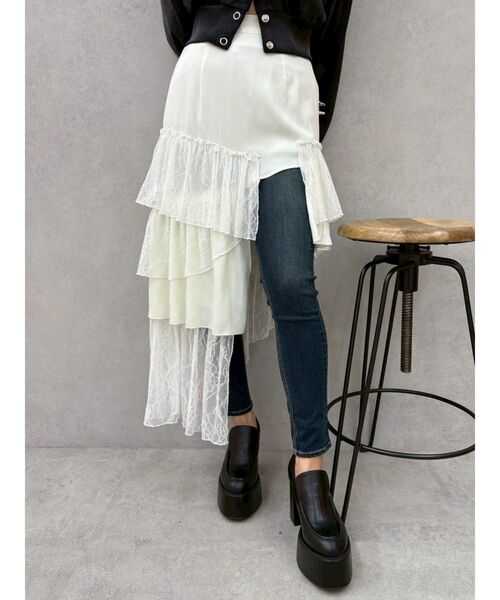 レースとサテンをミックスしたアシンメトリースカートです。ブラックカラーには、チェック柄や花柄を取り入れ、今季のシーズンテーマのBOHOスタイルに取り入れやすい1枚です。スリット入りで脚見せできるので、かわいくなりすぎず、ヘルシーな印象にもなります。