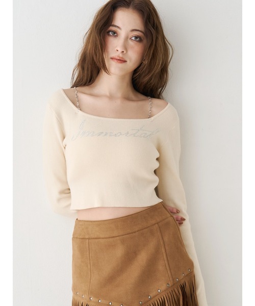 胸元にあしらわれたラインストーンロゴが視線を惹きつける、コンパクトシルエットのニットトップス。肩のストラップにもストーン付きのチェーンデザインを施し、さりげないアクセントに。スクエアネックでデコルテをすっきり見せつつ、短丈でトレンド感のあるバランスに。シンプルながらディテールで魅せる1枚です。薄手のニットなので、アウターの下にも合わせやすくアウターからちらりと覗くキラキラがポイントになります。Immortal・・・・永続するもの\お気に入り登録のメリット/①お気に入り登録をすると、商品のセール情報や再入荷情報、ラストなどをいち早くお知らせ②自分だけの商品リストが作れる「商品のお気に入り登録」で再入荷・ラスト・セールの通知を受け取ることができます。「ブランドのお気に入り登録」で新商品や再入荷、セール情報などのお得な情報を受け取ることができます!-------------------------------------≪お買い物をよりお楽しみいただくために≫◆商品のお気に入り登録(ハートマークをクリック)完売カラーの再入荷通知や、完売間近の通知、セールの通知も受けることができます。◆ブランドのお気に入り登録新商品や再入荷など、いち早くブランドのお得な情報を受け取ることができます。-------------------------------------■公式インスタグラム @evris_officialZOZOTOWNに掲載してない入荷情報や着用感、動画での紹介など随時更新中!■商品のお気に入り登録お気に入りアイテムのセール値下げ・再入荷・在庫1点など重要情報の通知をGET!■ブランドのお気に入り登録新商品や再入荷、セール、クーポン配布などお得な情報の通知をGET!