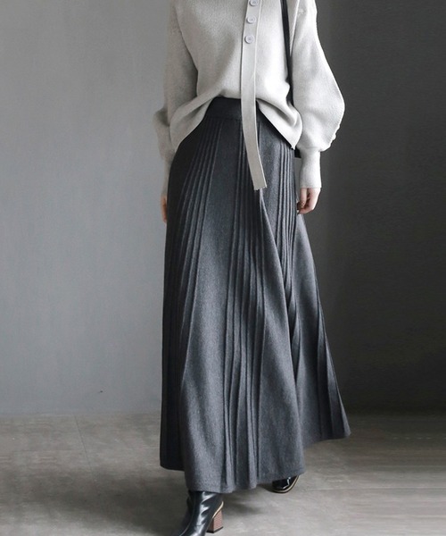 ニット素材で、やわらかく女っぽく。■デザイン縦ラインを強調するプリーツが美しい、ニット素材のロングスカート。歩くたびに揺れる柔らかな表情が、女性らしさを引き立てます。ウエストは総ゴム仕様で、ストレスフリーな履き心地。シンプルながらもシルエットで魅せる、秋冬の着回しに重宝する1枚です。■素材アクリル素材で、ふんわり軽くてあたたか。チクチクしにくく、肌当たりもやさしい着心地。ニットならではの伸縮性があり、動きやすく快適です。■スタイリング- コンパクトなニットやカーディガンと合わせて、バランスよく。- スウェットやパーカーで、カジュアルダウンも◎。- ブーツやローファーで足元に重さを出すと、ロング丈が映える。- トップスをインして、ウエストまわりをすっきり見せるのもおすすめ。-----------------透け感:なし伸縮性:あり裏地:なし----------------------------------------------------------------【お買い物をよりお楽しみいただく為に】▼お気に入り登録サイズ・カラーを指定して、♡マークをクリック![セール通知・ラスト1点の通知・完売アイテムの再入荷通知]を受け取ることができます。▼ブランドのお気に入り登録新商品や再入荷、タイムセールやクーポン等いち早くブランドのお得な情報を受け取ることができます。-----------------------------------------------※取り扱い上のご注意染色の特性上、発汗や摩擦により色落ちしたり他のものに色移りすることがありますのでご注意ください。韓国ファッション オフィスカジュアルガーリー大人カジュアル韓国ファッション秋服冬服