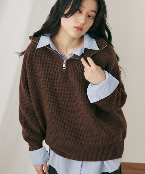 ハーフジップで着こなしのアレンジが楽しめるワッフルニット。■デザイン/素材凹凸と立体感のあるワッフル素材でざっくりと仕上げた、ボリューム感たっぷりのニット。しっかりとした肉厚感がありながらも、伸縮性に優れていて着心地は抜群で、空気をたっぷりと含む編地なので、保温性も高く、寒い季節にぴったり。ハーフジップ仕様でジップを上げればハイネックでスッキリと、下まで開ければスキッパー衿でリラックス感のある表情に。裾と袖のリブが程よくフィットし、カジュアルながらも整ったシルエットをキープ。1枚で様々な雰囲気を楽しめる万能アイテムです。■スタイリング1枚での着用はもちろん、ゆとりのあるサイズ感なのでシャツをレイヤードしたトレンドのスタイルもおすすめ。イージーパンツと合わせたリラックススタイルから、スカートと合わせてレディライクなスタイルまで幅広いスタイルにマッチする万能アイテムです。……………………透け感 : なし厚さ:普通伸縮性:ありお手入れ方法:手洗い推奨……………………※ご注意※・屋外の光や照明の当たり具合で、実際の商品の色味とカラー別画像の色味に若干の違いが発生する場合がございます。・詳細画像と併せてご確認の上、ご注文いただきますようお願い致します。【MERLOT】ジャンルレス、ジェンダーレスをテーマにヴィンテージライクからモダンなアイテムまで幅広く展開。 メンズとレディース、カジュアルとモード。あらゆる境界を取り払うミックススタイルを提案します。【商品のお気に入り登録】完売カラーの再入荷通知やラスト1点の通知、プライスダウンの通知を受け取ることが出来ます。【ブランドのお気に入り登録】新商品や再入荷など、嬉しい情報を受け取る事が出来ます。ぜひご登録ください◎※ご注文いただいた予約商品のお届け時期の確認は、注文履歴ページより行えます。ストリート/シティ/シティボーイ/シティガール/メンズライク/テック/ノームコア/古着ライク/ カジュアル / トレンド / オールシーズン /秋服/冬服/ユニセックス