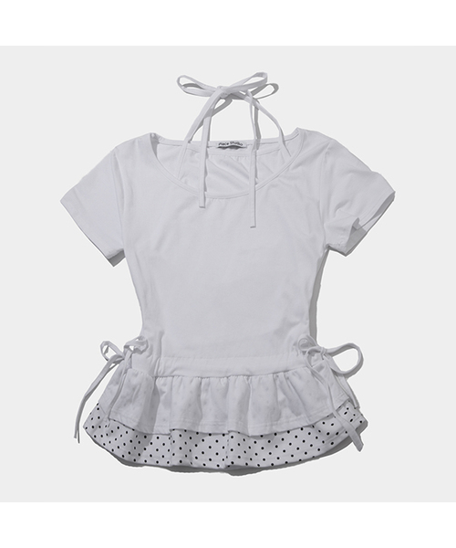 ストラップノースリーブレイヤードシャーリングドットフリル半袖Tシャツ _ 2COLOR