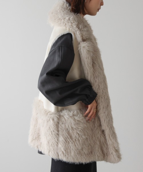■POINTふっくらとしたボリューム感が魅力のコクーンシルエットベスト。ヒップまですっぽり隠れる丈感で、気になる下半身もさりげなくカバー。フロントや裾に切り替えたふわふわのファーが、スタイリングに高級感と華やかさをプラスします。シンプルなニットやワンピースに羽織るだけで、たちまち旬の雰囲気に。存在感がありながらも軽やかで、デイリーにもお出かけにも活躍する一枚です。■FABRICなめらかなスエード調素材と柔らかなファーを贅沢に切り替えた、表情豊かなデザイン。暖かみがありながら軽い着心地で、長時間の着用も快適に。裏面まで丁寧に仕上げられた質感が、見た目にも手触りにも上品さを感じさせます。…………………透け感:なし裏地:なし…………………★商品のお気に入り登録 登録すると、完売しても再入荷時に通知を受け取ることができます。 ほかにもお得な特典があるかもしれません♪ ★ブランドのお気に入り登録 新商品や再入荷などの情報を受け取ることができますので、是非ご登録ください♪