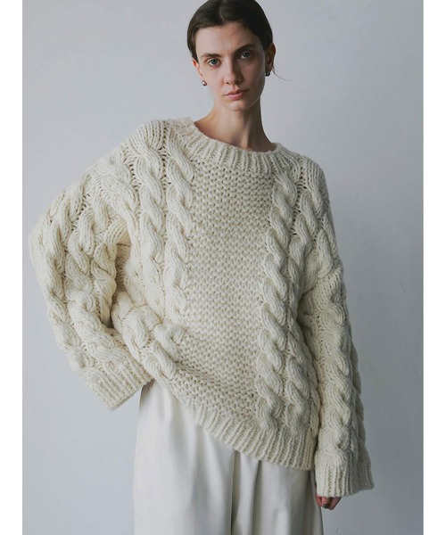太番手の糸で1枚1枚丁寧に手編みしたニットプルオーバー。中心のハニカム柄と太いケーブル柄が組み合わさったアイコンシャスな1枚。立体的で温かみのある編み柄はハンドニットならでは。迫力のあるワイドスリーブで1枚で着てサマになるアイテムに仕上げました。 ※実際の商品は襟元が少し立ち上がっているデザインとなります。 ※画像の商品はサンプルです。実際の商品と色味、仕様、加工、サイズ、素材等が若干異なる場合がございます。 ※アイテムサイズは商品サンプルを採寸しているため、実際の商品と多少の誤差が生じる場合がございます。 ※末永く愛用頂く為に、アテンションタグ・洗濯ネームを必ずご確認の上、着用又はお取り扱い下さい。 ※HER.のネームタグは直接肌に触れる部分のため、お客様自身で取り外しがしやすいように軽い縫い付けの仕様となっております。取れやすくなっておりますが、不良ではございませんので予めご了承頂けますようお願い致します。 ・洗濯:ドライクリーニング