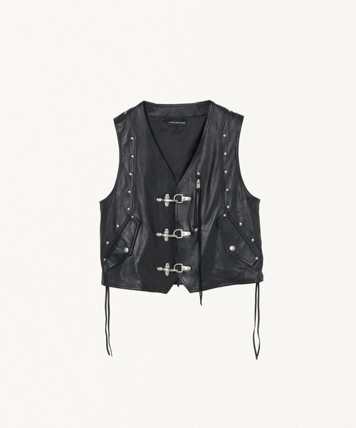 上質なラムレザーを使用したバイカーモチーフのレザーベスト。コンパクトなシルエットに、本格的なファイヤーマンバックルと各所のリベットやDリング使いなどディティールを多数搭載した一着です。 ・バックに付くTmレザーパッチ ※商品を受け取ってから8日以上が経った商品、ブランドタグや梱包を失くされた商品、また、着用感が見られる商品は返品交換を受け付けられないことがございます。予めご了承くださいませ。 【FORSOMEONE(フォーサムワン) 】 2018年秋冬コレクションより本格始動した ボーダーレスでジェンダーレスなブランド。 「ニュー レガシー」をテーマに掲げ、UKやUSのカルチャー、ヴィンテージにインスパイアされたFORSOMEONEはスタイリッシュでコンフィでありながらもアーバンな品格を持ち合わせたラグジュアリーなコレクションを発表。 ■商品お気に入り登録 再入荷、残り1点、セールなどの通知を受け取ることが出来ます。 ■ブランドお気に入り登録 新商品や再入荷、ショップのおすすめトピックスなど、いち早くブランドのお得な情報を受け取ることができます。