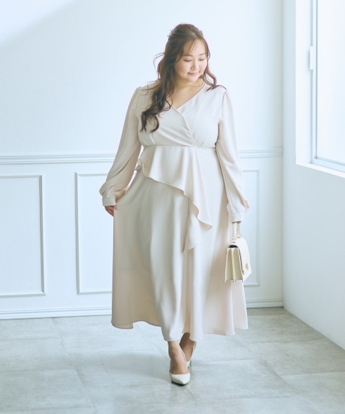 【らめちゃん×nissenコラボ】柔らかく上品な印象で、体のラインを美しく見せてくれるワンピース■デザイン・カシュクールデザインでデコルテラインもスッキリ見せしてくれます。・ウエストのペプラム風フリルデザインで斜めの切り替えが入ることで、上半身を細く見せる効果があります。・軽くフレア状に広がるデザインになっているので、お腹や腰まわりをふんわりカバーしながら、スタイルアップして見せてくれます。・また、同素材のベルト付きなので取り外し可能。糸ループにしているので、ベルトなしでもスッキリ着用できます。・高い位置でウエストマークできるのでベルトを付けて更にスタイルアップさせてくれます。■素材やわらかく流れるような落ち感のある素材。■おすすめのスタイリングアクセサリーはシンプルなもの、シューズはベージュやグレージュなどのパンプス合わせのスタイリングがおすすめです。<仕様>後ファスナー 袖口ボタン開き 共布ベルト付 透け感:なし伸縮性:なし生地の厚み:普通光沢感:なし裏地:あり(身頃・スカート)ポケット:なし季節:春・秋向きシルエット:普通<洗濯方法>洗濯機OK ネット使用---------------------------------------------■らめちゃん紹介 Instagramアカウント @ramerameramechan大きいサイズ・ぽっちゃり女子向けのプチプラ高見えコーデを発信するインフルエンサー。体型にとらわれないおしゃれの楽しみ方やスタイルアップ術が好評。同じ悩みを持つ女性たちから厚い支持を集めています。B/115 W/108 H/125■ JERRYSELECT conceptレディースファッションセレクトショップ思わず誰もが見惚れてしまうお洋服きらきらした宝石の中から =様々なテーストの中からセレクトした宝石 =お洋服をご紹介▼公式Instagramはこちら@jerryselect_official---------------------------------------------<対応サイズ>L :バスト:86~94/ウエスト:69~77/ヒップ:92~100LL :バスト:93~101/ウエスト:77~85/ヒップ:97~1053L :バスト:100~108/ウエスト:85~93/ヒップ:102~1104L :バスト:107~115/ウエスト:93~101/ヒップ:107~1155L :バスト:114~122/ウエスト:101~109/ヒップ:112~120※こちらはヌードサイズです。※平置きのアイテムサイズとは異なる計測方法となりますのでご了承ください。#ゆったり#体型カバー#二の腕カバー#大きいサイズ#プラスサイズ#大きいサイズレディース#M#L#LL#3L#4L#5L【気になる商品はお気に入り登録がおすすめ】▼商品のお気に入り登録完売カラーの再入荷通知や、ラスト1点の通知、セールの通知などお得な情報が受け取れます。▼ブランドのお気に入り登録新商品や再入荷など、ブランドのお得な情報をいち早く受け取ることができます。